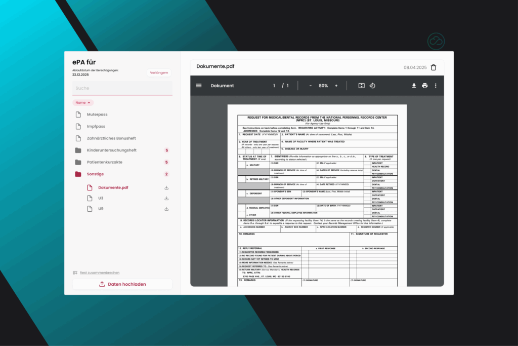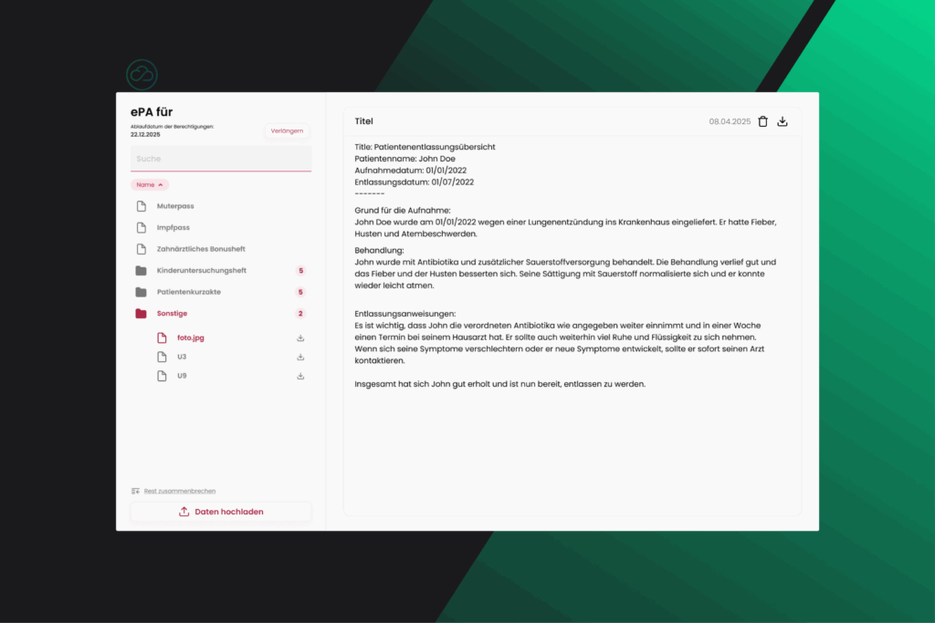 - Unterstützung gängiger Formate: PDF, Bilder, strukturierte MIOs wie Medikationspläne